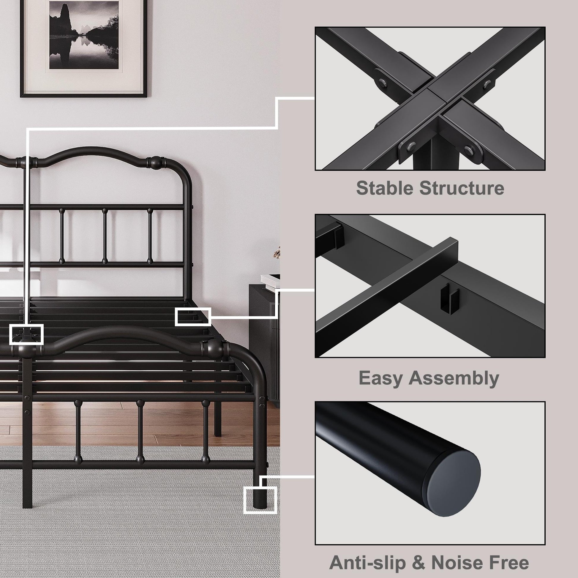Cadre de lit en métal robuste de 14 pouces de haut avec style vintage, supporte jusqu'à 2500 lb, assemblage facile et sans grincement