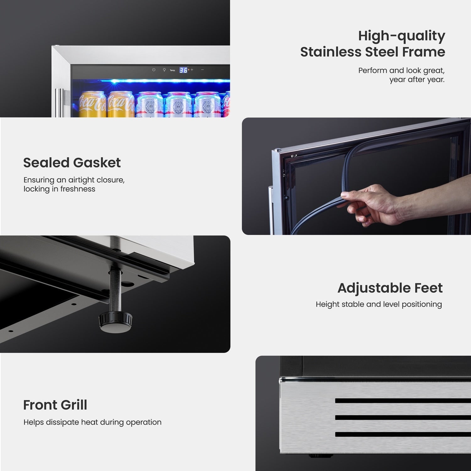 - Design élégant et sécurisé : Ce réfrigérateur à boissons est doté d'une élégante porte en acier inoxydable avec poignée en L et double vitrage résistant aux UV. Son esthétique moderne s'intègre parfaitement à tous les décors.