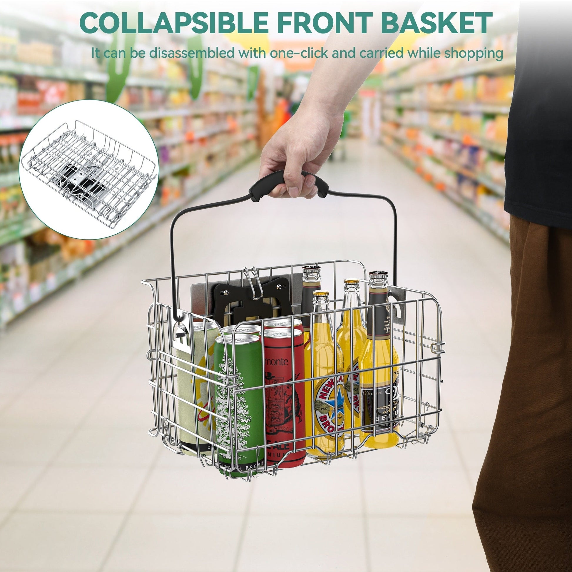 - Le panier avant est pliable et amovible, et vous pouvez le transporter pour faire vos courses avec un seul bouton de démontage