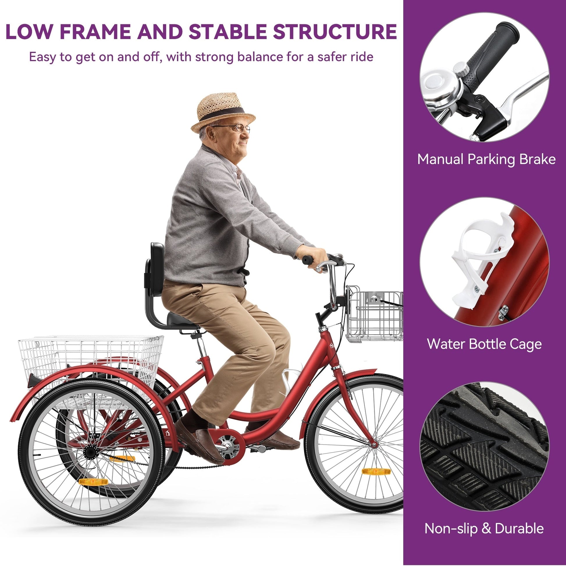 Ce tricycle est idéal pour les balades décontractées, l'exercice, les courses, les pique-niques en plein air et bien plus encore. Avec ce tricycle, vous pouvez explorer librement, profiter de la balade et profiter du soleil et de l'air frais.