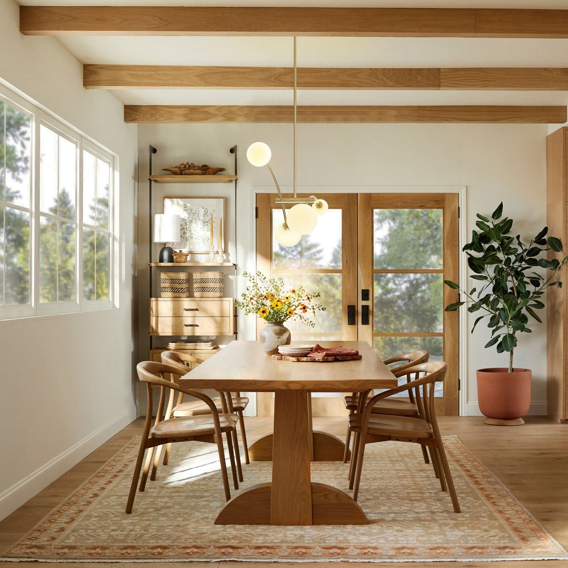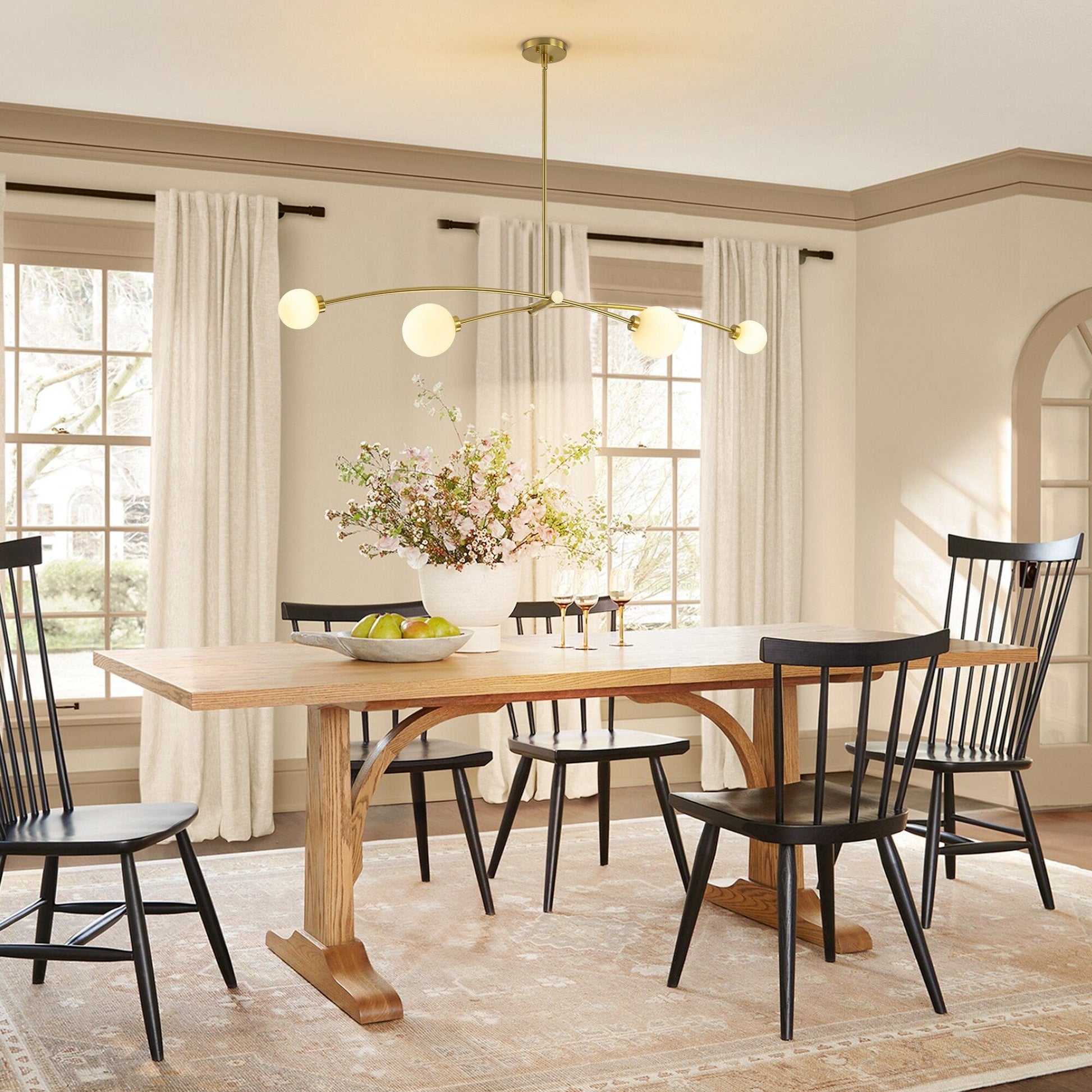 Inspiré du minimalisme moderne et du design Spoutnik, ce lustre linéaire à 4 lumières allie d'élégants arcs dorés à des globes en verre dépoli pour une allure contemporaine et élégante. Les tiges métalliques légèrement courbées se prolongent vers l'extérieur dans une configuration harmonieuse, créant une silhouette élégante qui sublime l'esthétique de tout espace. Idéal pour les îlots de cuisine, les salles à manger ou les bureaux à domicile, ce luminaire offre non seulement un éclairage généreux, mais constitue également un élément de design remarquable dans votre intérieur. Caractéristiques :