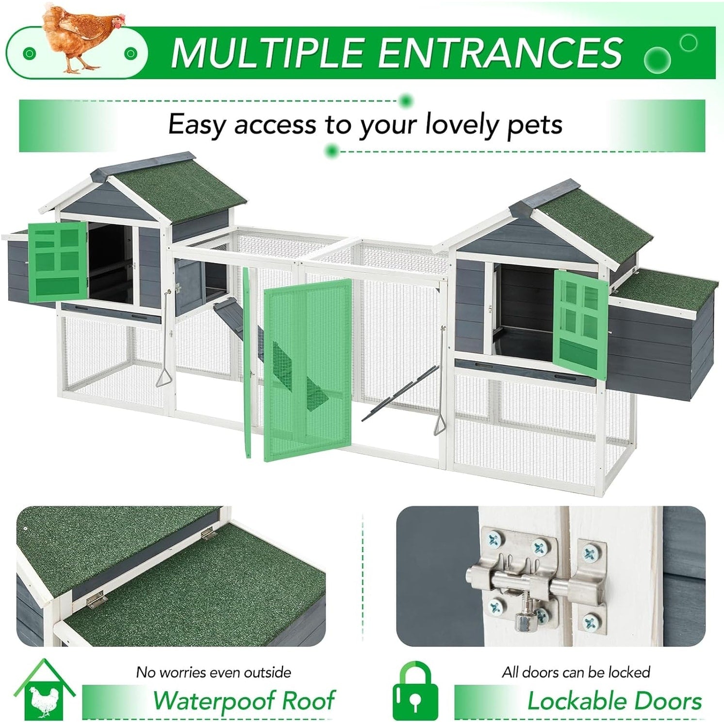- Grand espace de vie – Ce grand poulailler est conçu en deux niveaux : un poulailler principal pour dormir à l'étage et une cage de course protégée par un grillage à l'étage inférieur. Les animaux domestiques peuvent également bénéficier d'un logement de luxe.