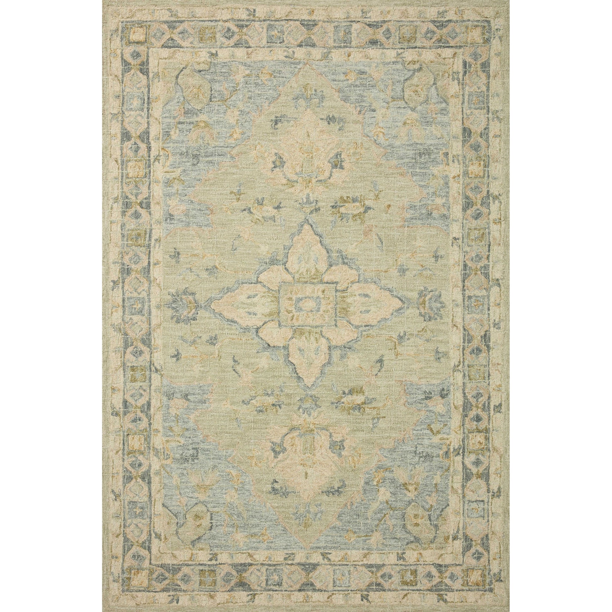 Rehaussez votre décoration traditionnelle avec un tapis inspiré des mosaïques d'antan. Un motif croisé ample sur un motif floral crée un style classique. Ce tapis décoratif est confectionné dans un vert écume de mer discret décliné en différentes nuances. Les fibres de laine sont crochetées à la main pour une texture nouée qui rehausse l'aspect vieilli.