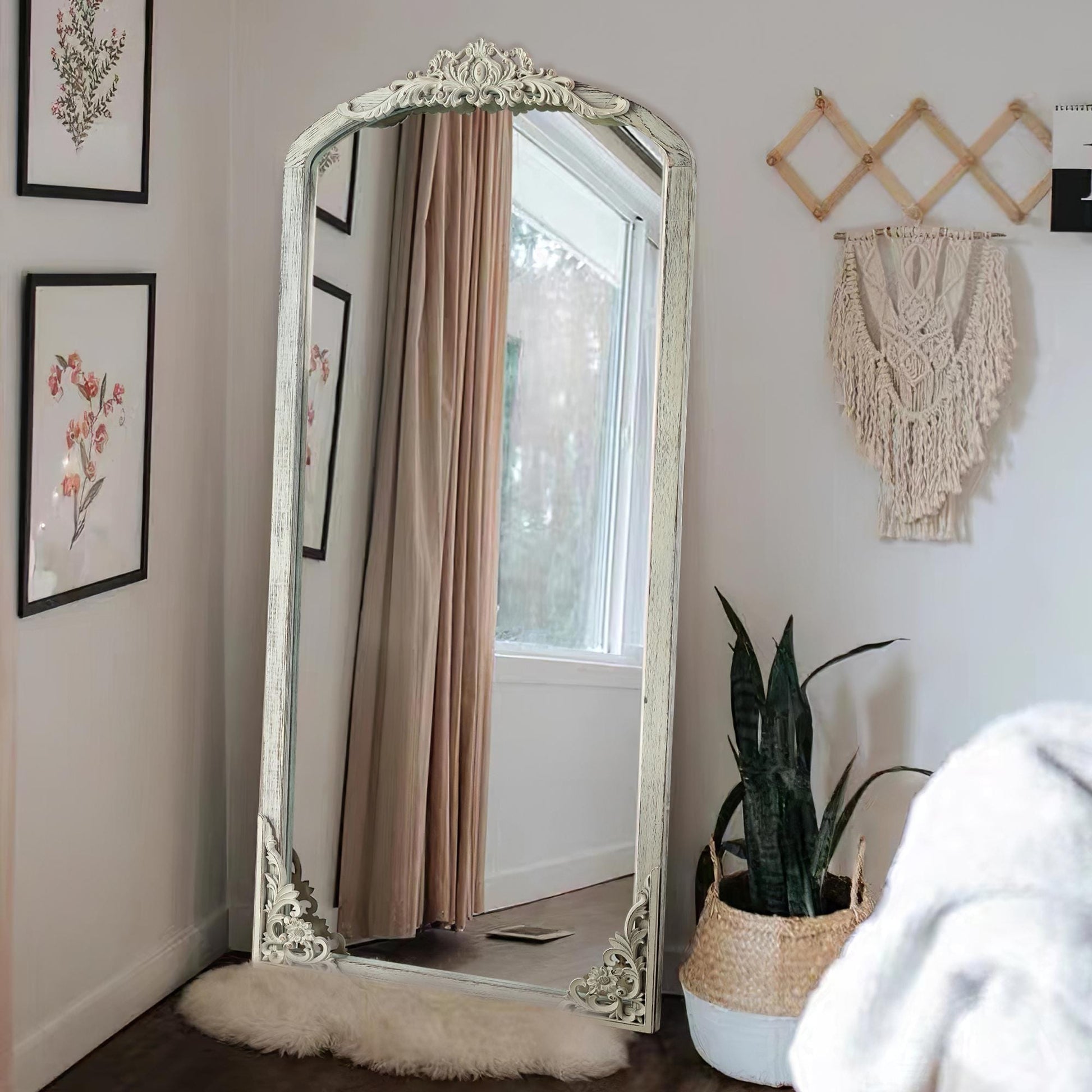 Sublimez l'ambiance de votre pièce grâce à l'élégance intemporelle de ce miroir de sol en bois massif. Sa silhouette arquée et son motif de carreaux délicats créent une illusion d'optique d'inspiration vintage qui sublime votre espace et confère une touche d'originalité à tout décor.