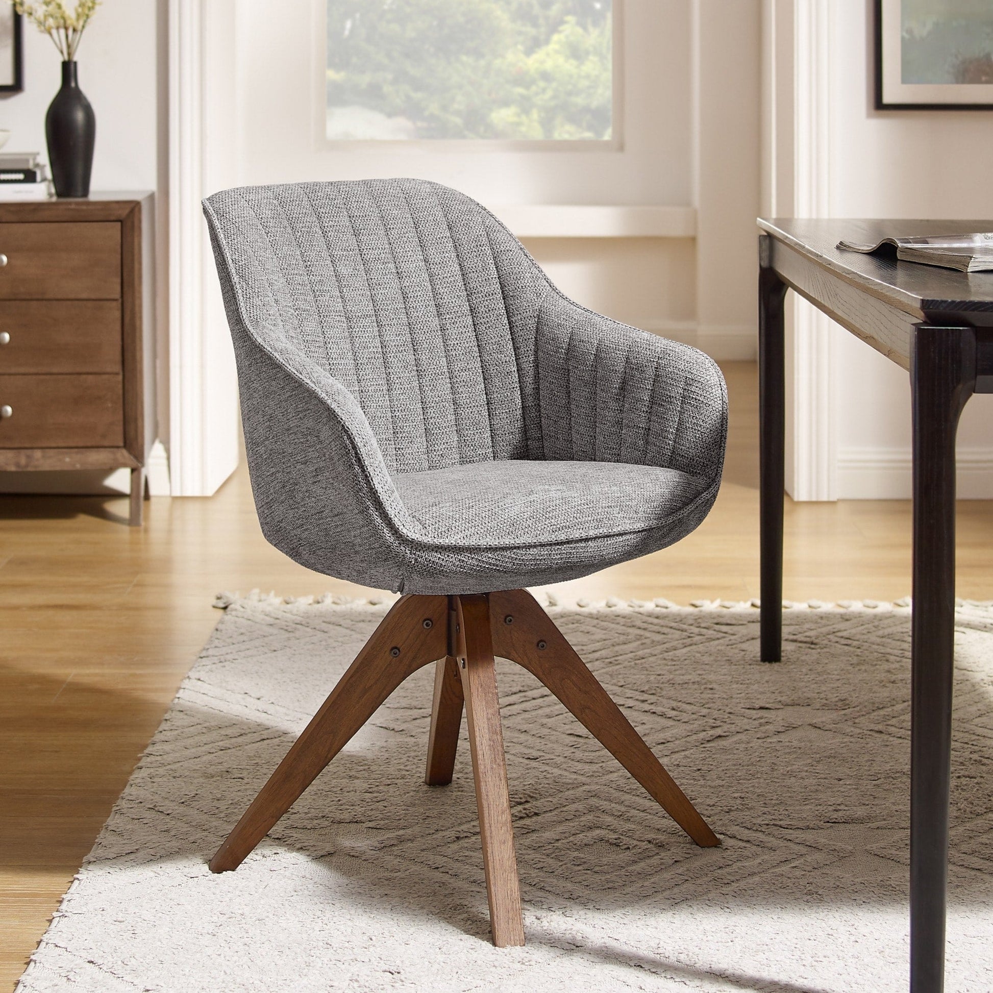 Modernisez votre bureau à domicile avec cet élégant fauteuil d'appoint pivotant. Son design moderne du milieu du siècle présente une assise moulée avec des accoudoirs inclinés et un capitonnage à rainures le long du dossier et des accoudoirs. L'assise confortable et rembourrée et le dossier inclinable sont revêtus de tissu ou de similicuir, au choix. Les pieds évasés en hêtre massif, laqués noyer, s'étendent vers l'extérieur pour un look rétro. Le fauteuil pivote également à 360 degrés pour plus de fonctionnalité.