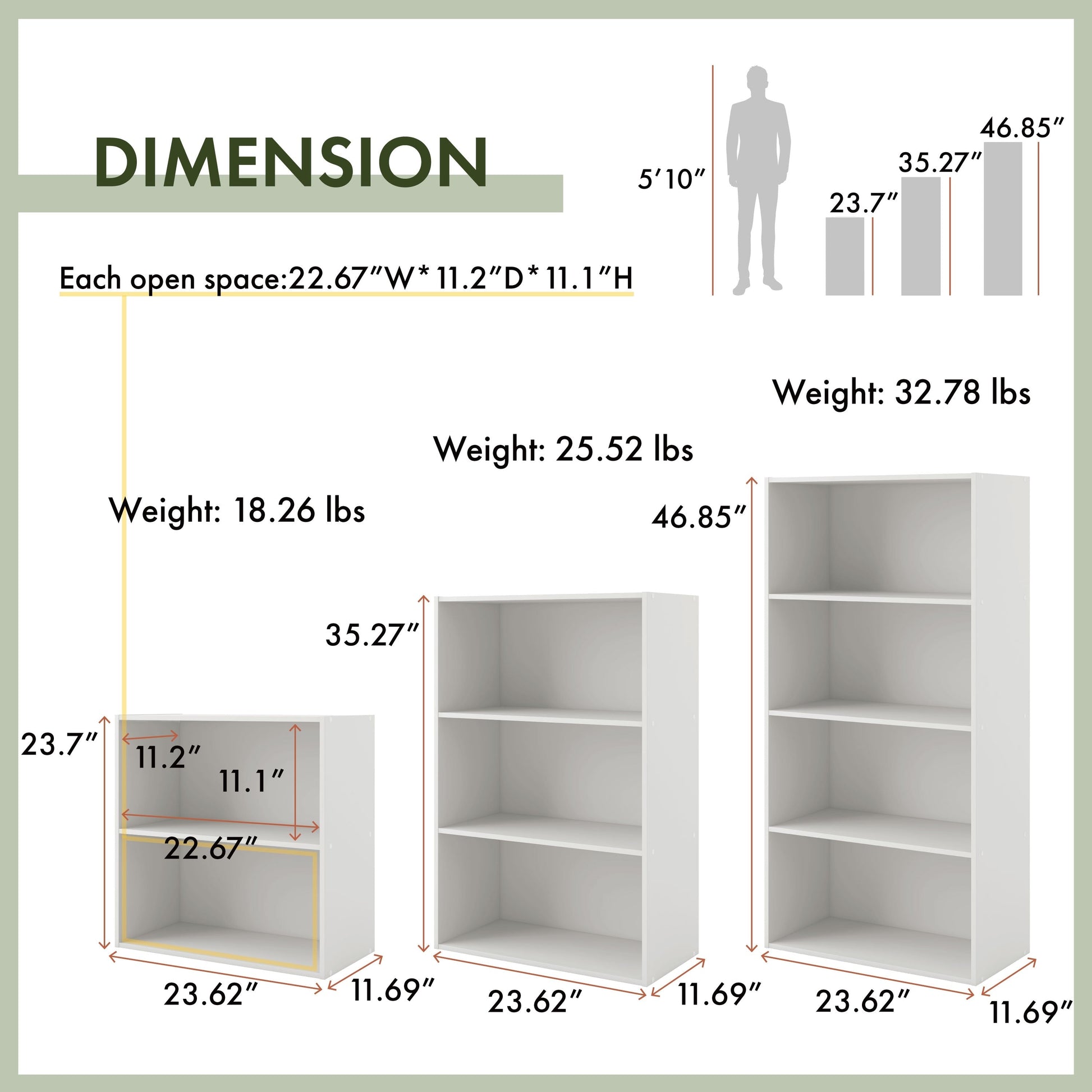 - Étagère ouverte : 11,1 pouces de hauteur x 22,67 pouces de largeur x 11,2 pouces de profondeur
