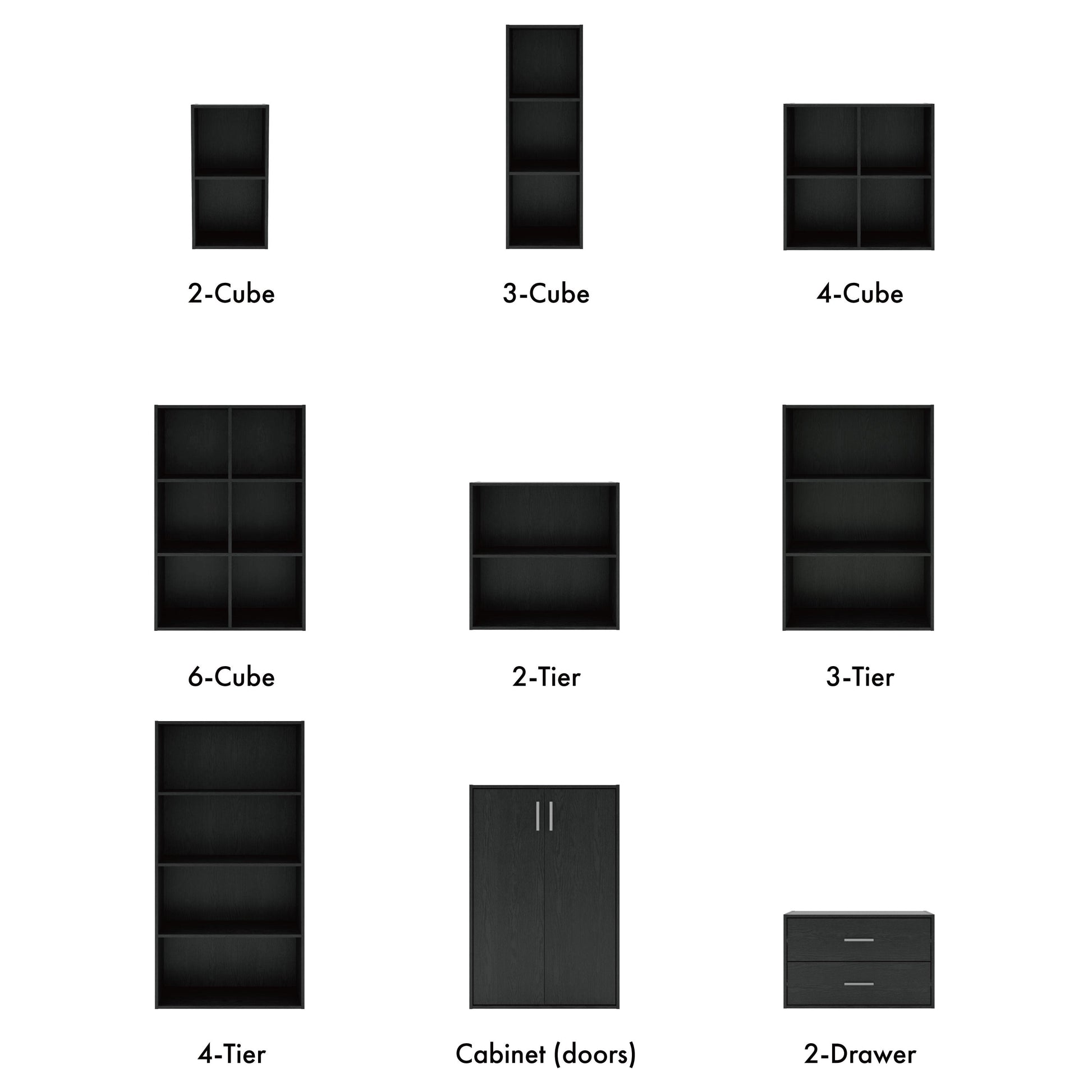 - Options empilables de 24 pieds de large (à combiner librement) : 4 cubes, 6 cubes, 2 niveaux, 3 niveaux, 4 niveaux, armoire à 3 niveaux et 2 tiroirs