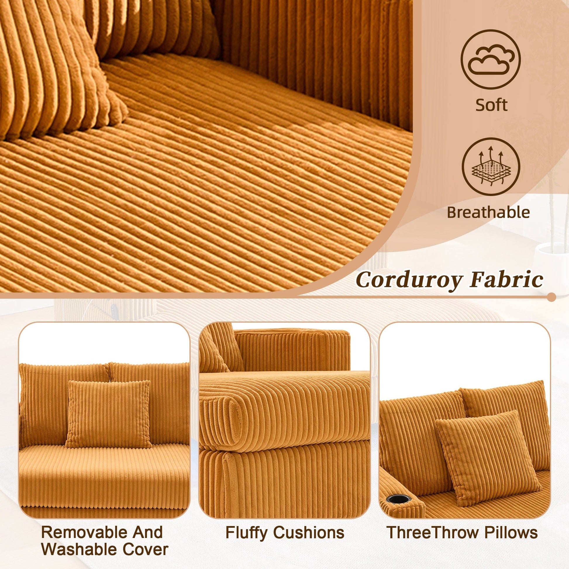 - Tissu velours côtelé, pour un confort optimal : ce produit est fabriqué en velours côtelé, doux et agréable au toucher. Son revêtement extérieur amovible et lavable permet de nettoyer facilement les taches quotidiennes et de le garder propre et pratique. Le coussin d'assise moelleux, garni d'un matériau haute résilience, offre une assise confortable et ne s'affaisse pas facilement après une utilisation prolongée. Il est livré avec trois coussins, qui peuvent être assortis aux dossiers ou utilisés en décoration, pour une expérience d'assise et de couchage optimale.