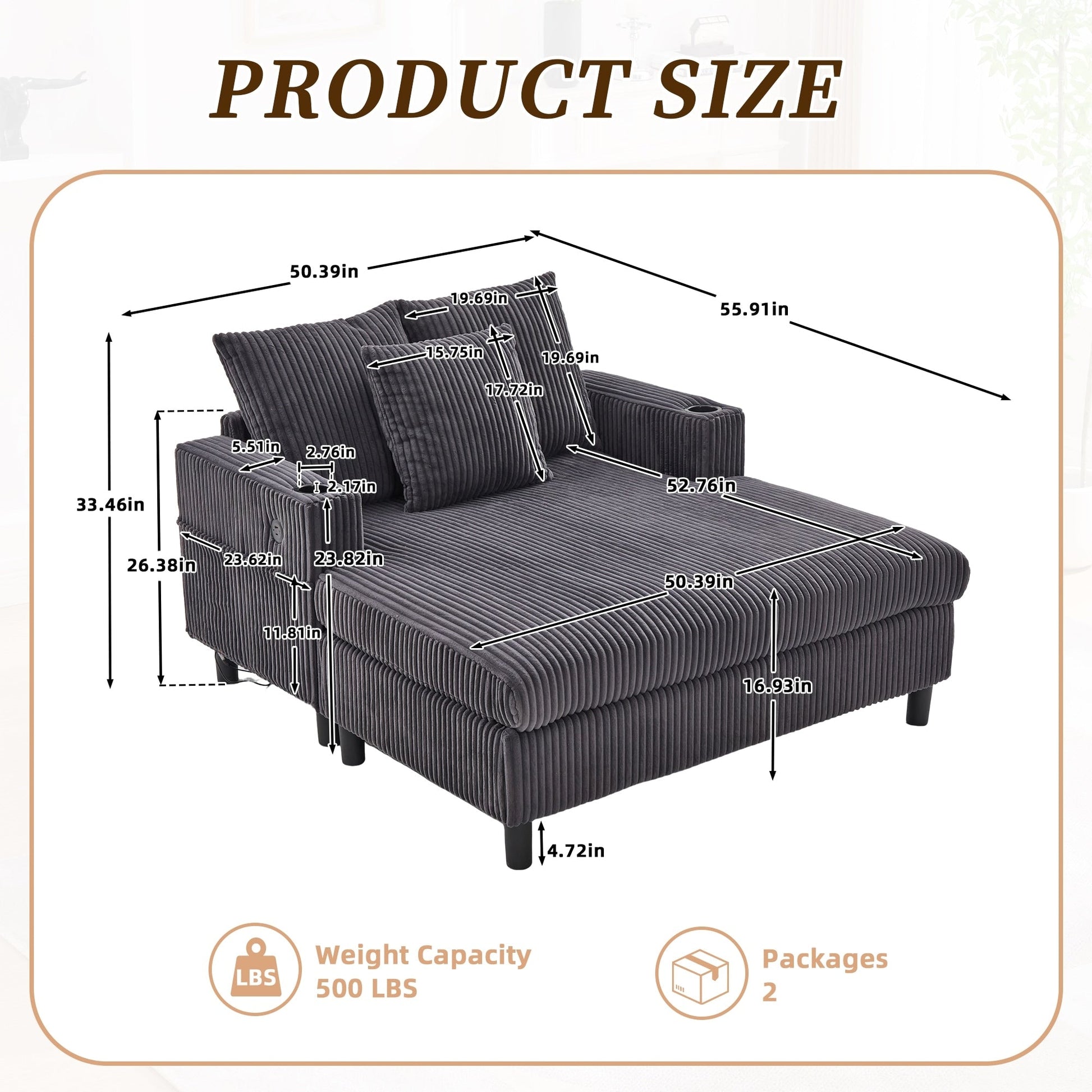 - 1*USB(5V-2.4A)+1*Type-c(5V-2.4A) Ports Type-C et USB pratiques : le canapé est doté d'un port de charge 1¡ÁUSB (5V-2.4A) + 1¡ÁType-C (5V-2.4A) intégré, qui peut être chargé à tout moment, faisant du canapé la « station d'alimentation en énergie » dans le salon, afin que vous puissiez rattraper le drame et le travail de bureau sans perdre de puissance, et profiter du confort et de la commodité en une seule étape !