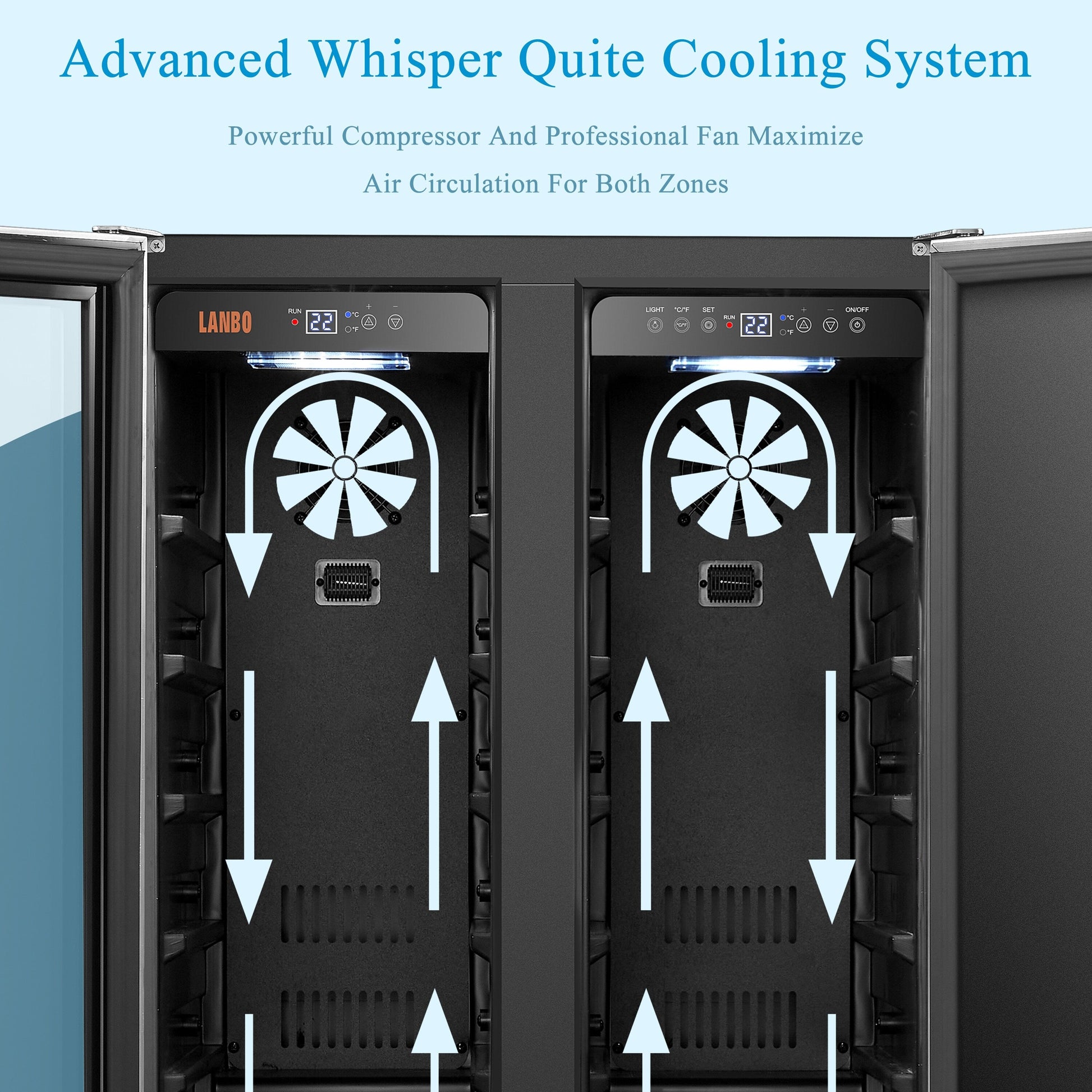 Conservez vos vins et boissons préférés à la température idéale grâce à notre cave à vin Lanbo LB36BAA en acier inoxydable et verre avec portes françaises. Dotée de deux zones de température distinctes et indépendantes, la zone gauche permet de régler la température de vos vins de 5 à 18 °C et celle de vos boissons de 3 à 10 °C. Un compresseur puissant et silencieux et un système de ventilation sophistiqué maintiennent vos vins et boissons à la température précise souhaitée. Grâce à sa ventilation frontale, vous pouvez l'installer directement dans votre meuble pour un style sophistiqué et personnalisé, ou l'exposer où vous le souhaitez grâce à son modèle indépendant. Peut contenir jusqu'à 18 bouteilles de vin (format standard de 750 ml) et 55 canettes. La cave à vin Lanbo LB36BAA conserve vos vins et boissons préférés à la perfection. Pour plus de commodité, vous pouvez conserver certains aliments (si vous le souhaitez) dans le compartiment réservé aux canettes, à droite.