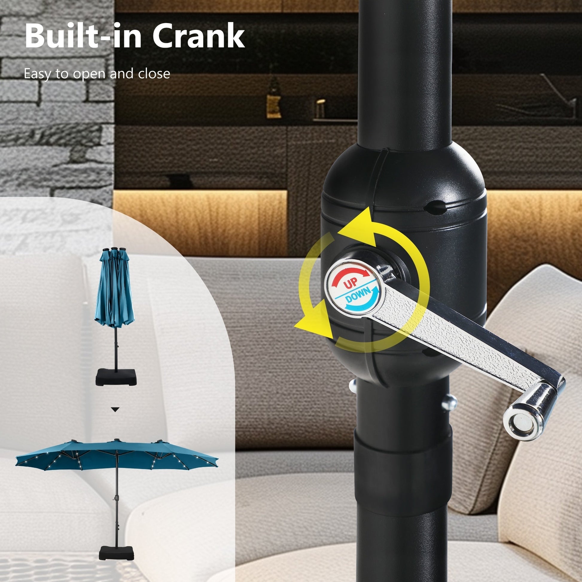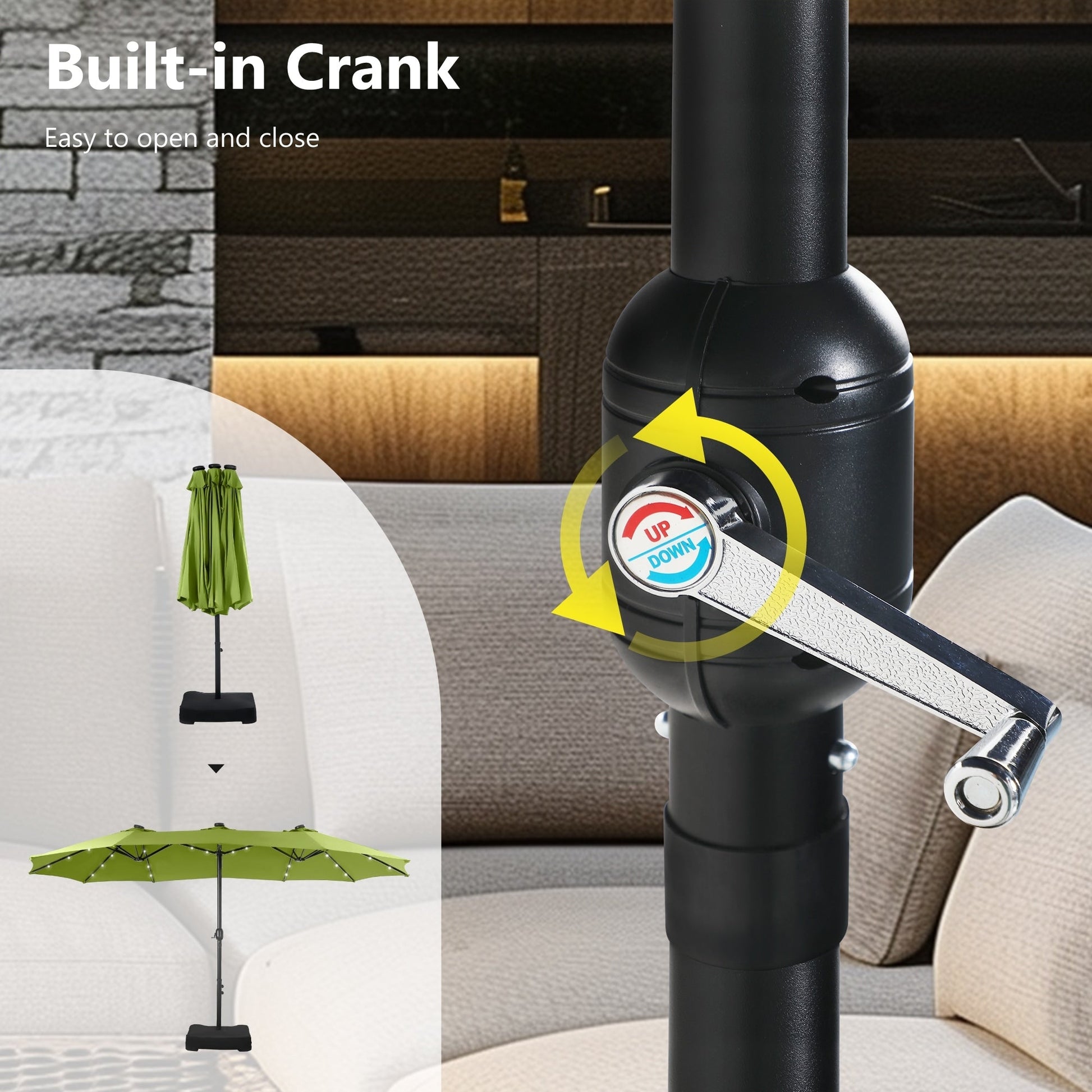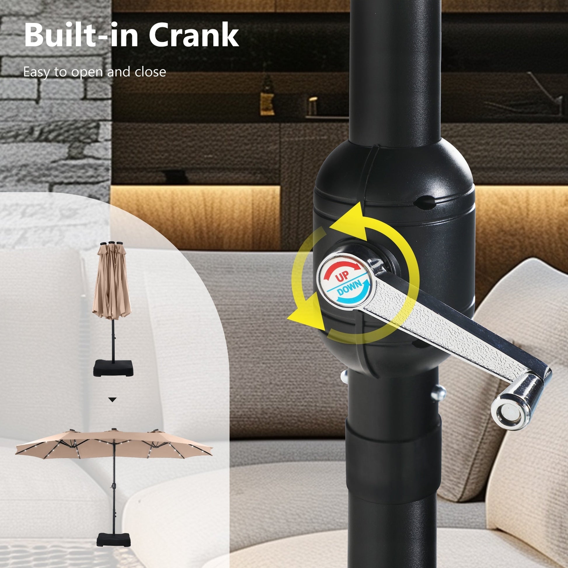 MAISON ARTS Parasol de marché extérieur rectangulaire à manivelle double face de 15 pieds Parasol de patio éclairé par LED solaire avec base incluse
