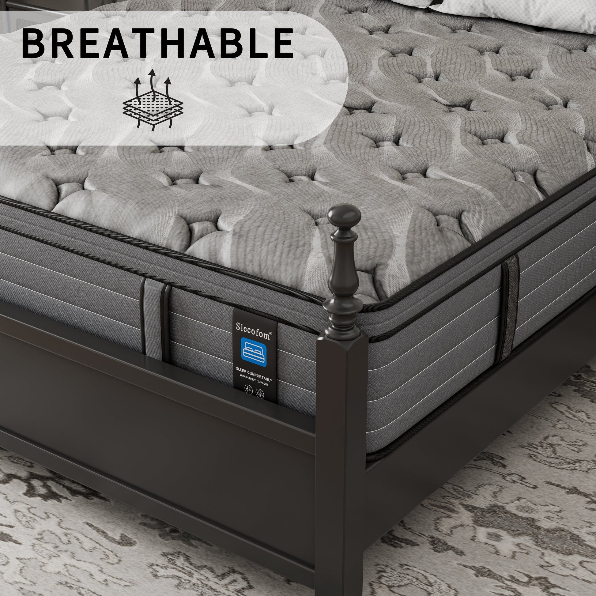 La housse tricotée en fibre ignifuge évacue l'humidité, tandis que les couches de mousse respirante favorisent la circulation de l'air. Dormez 3 °C de moins que les matelas hybrides traditionnels (pas de sueurs nocturnes !). -