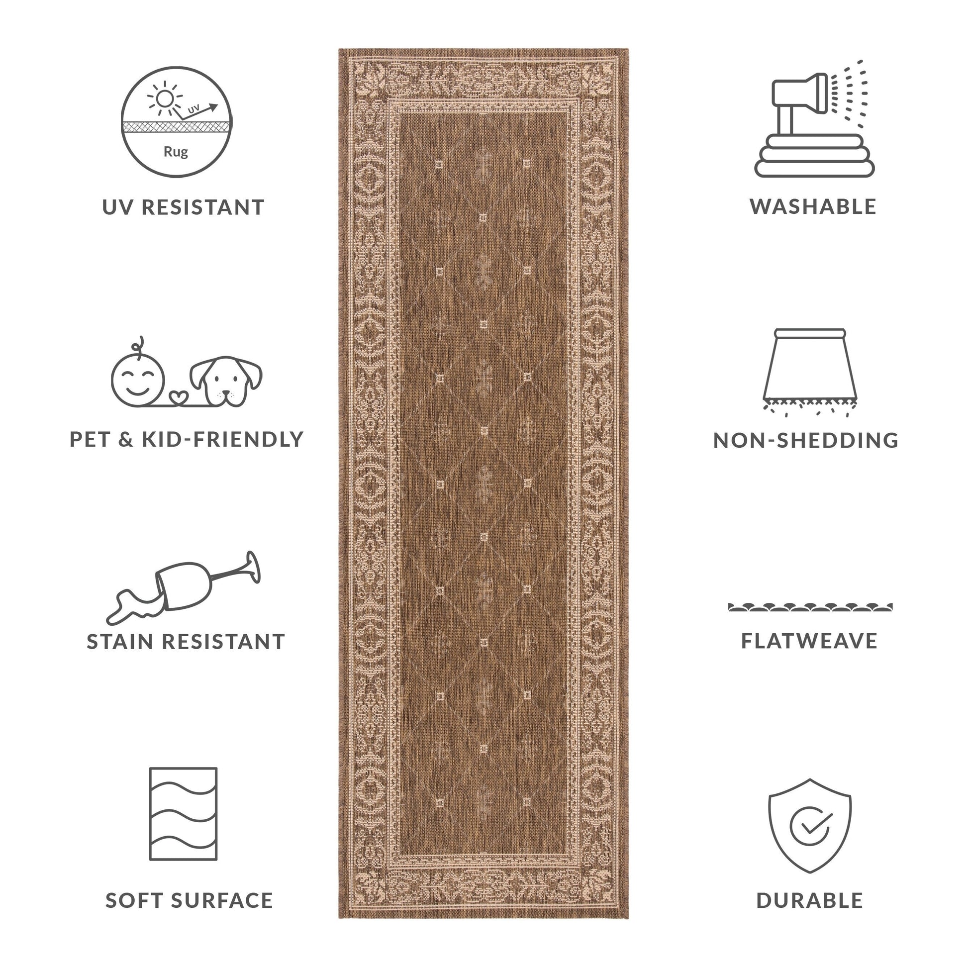 Idéal pour votre jardin, patio, terrasse, véranda ou bord de piscine, cet élégant tapis de la collection Courtyard est un ajout pratique à tout espace de vie extérieur ou intérieur. Adapté aux animaux et aux enfants, ce tapis facile d'entretien convient également aux zones à fort passage comme le vestiaire ou la cuisine. Cette magnifique collection de tapis révolutionne la décoration extérieure avec de nouveaux designs aux couleurs tendance et des motifs allant du classique au contemporain.