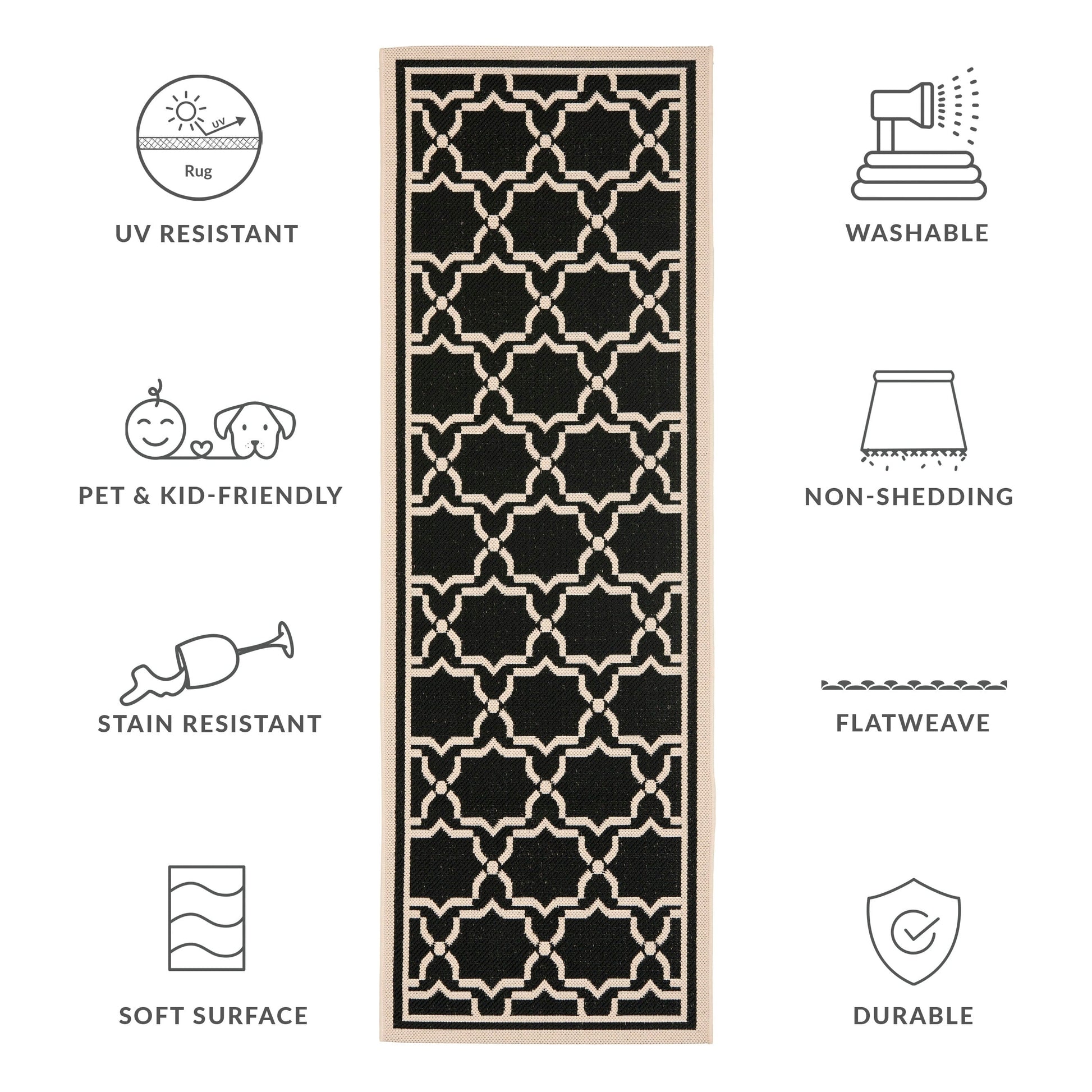 Idéal pour votre jardin, patio, terrasse, véranda ou bord de piscine, cet élégant tapis de la collection Courtyard est un ajout pratique à tout espace de vie extérieur ou intérieur. Adapté aux animaux et aux enfants, ce tapis facile d'entretien convient également aux zones à fort passage comme le vestiaire ou la cuisine. Cette magnifique collection de tapis révolutionne la décoration extérieure avec de nouveaux designs aux couleurs tendance et des motifs allant du classique au contemporain.