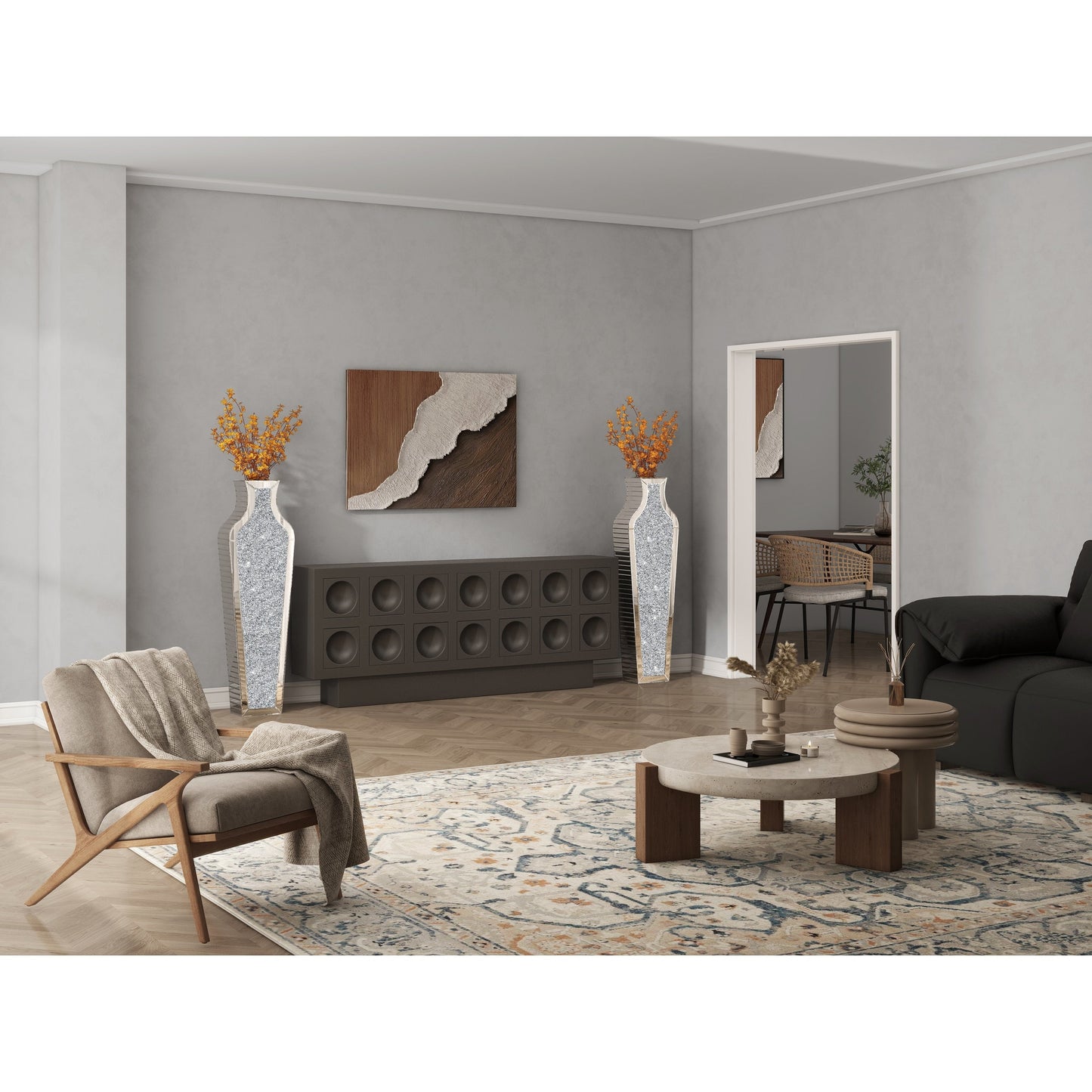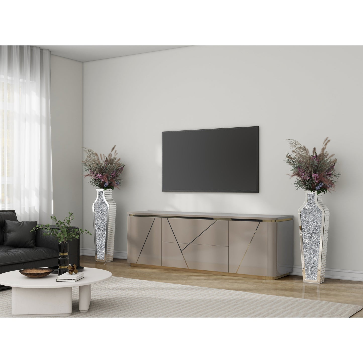 Si vous aimez décorer votre intérieur, ce vase de sol sera le choix idéal. Il trouvera sa place dans n'importe quel coin, notamment à l'entrée, près du meuble TV ou au milieu du canapé. Appréciez son design sur des fonds unis dans un cadre élégant. Il constitue une décoration unique sur une cheminée, une console ou tout autre espace de vie. Doté d'un plateau en miroir et d'un corps en diamants concassés, ce vase de sol décoratif, orné de plantes et de fleurs, apportera luminosité et texture à votre intérieur. Convient pour une utilisation en intérieur. Style glamour. Ouverture de 11,7 cm, miroir argenté de 70,9 cm, 91,4 cm et 110 cm.