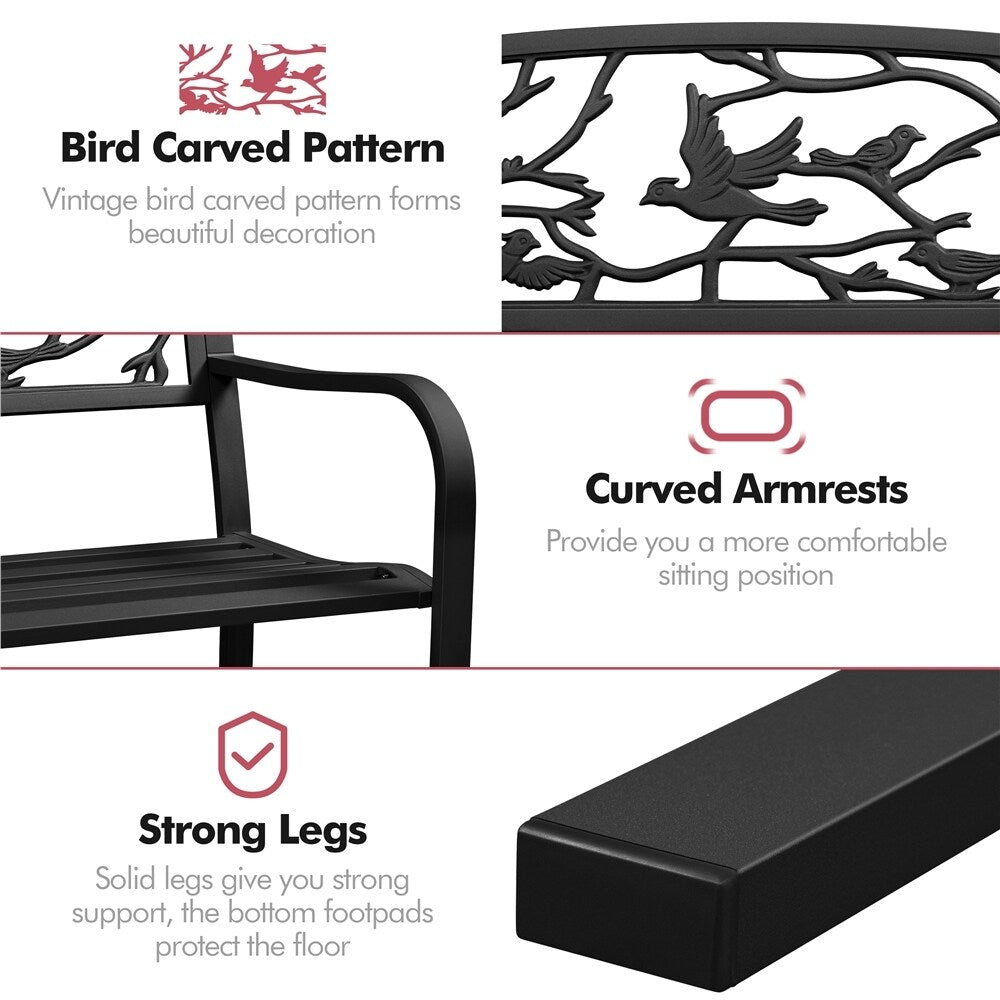 Apportez une touche de nature à votre espace extérieur avec notre banc de jardin Yaheetech de 15 m. Le motif d'oiseaux vintage du dossier embellit et favorise la circulation de l'air, tandis que l'assise légèrement incurvée, large et profonde, offre un confort optimal. Fabriqué en fer robuste avec un revêtement imperméable, ce banc est robuste et durable pour une utilisation prolongée. Avec une charge maximale de 180 kg (397 lb), il convient aux parcs, jardins, mariages, etc. Les accoudoirs sont incurvés pour plus de confort, et l'assise est soigneusement conçue avec des rayures verticales pour une meilleure circulation et une meilleure répartition du poids. Sa finition résistante aux intempéries garantit une durabilité optimale par tous les temps, et son montage est facile grâce aux outils et aux instructions fournis.
